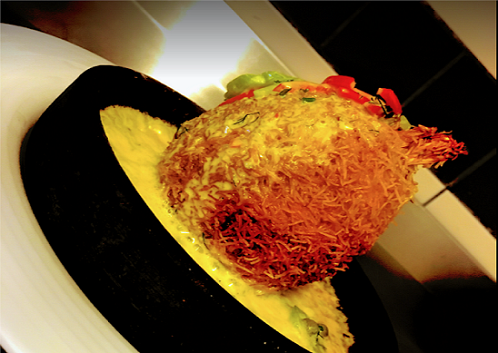 Avakado, jumbo karides, karides, tel kadayıf, özel sos / Avocado, jumbo shrimps, shredded phyloo dough, chef’s special dressing